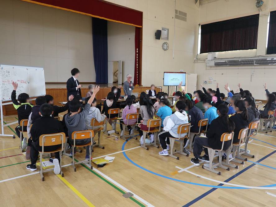 11月6日(木)に、5年生を対象に総合的な学習で福祉出前講座が行われました。視覚障がいをもつ方々を学校にお招きし、障がいについてのお話や生活の工夫などについて教えていただきました。学習では子どもたちがアイマスクをしてブラインド卓球に挑戦したり、視角障がいをもつ方々の介助の仕方を学んだりして、目の見えないことの大変さやどのような手助けが必要なのかを身をもって体験することができました。子どもたちが事前に調べて学習していた以外のお話もたくさん話していただき、子どもたちは真剣にメモをとっていました。今回の出前授業の講義や体験をもとに、これから5年生は福祉について学びを深めていきます。
