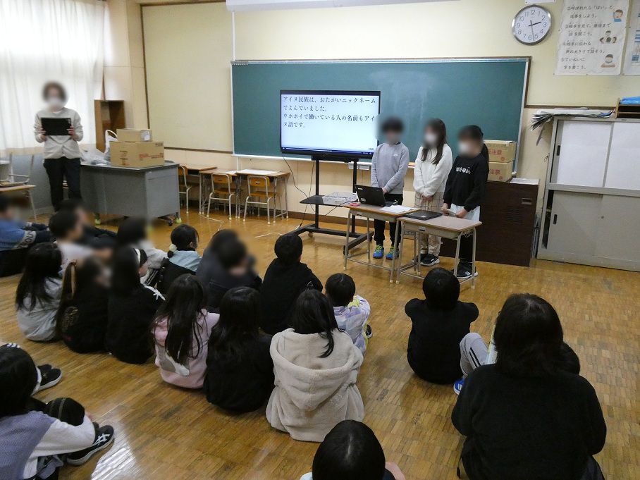 12月19日(金)に、4年生が総合的な学習の時間に今まで調べてきたアイヌ民族の文化について3年生に向けて発表を行いました。参観日に保護者の皆様に向けて同じ発表を行った4年生でしたが、今回は3年生に向けての発表です。4年生は、より分かりやすい言葉遣いや話すスピード、資料の示し方を事前に練習して発表に臨みました。3年生は次年度に学習するアイヌ民族について、それぞれのグループの発表をとても熱心に聞き入っていました。4年生は発表や進行の仕方について上級生らしいワンランク上の態度を見せることができました。