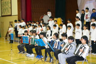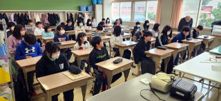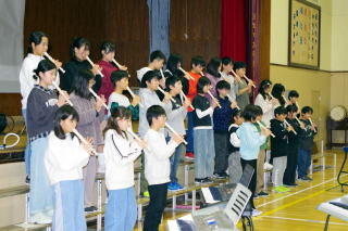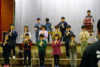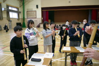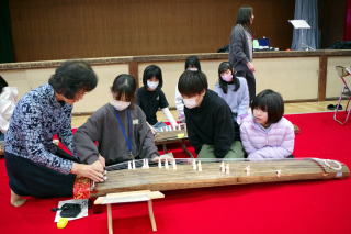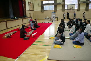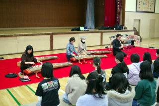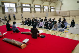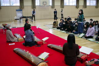 | 毎年、市内の6年生を対象に音楽の授業として行われている「邦楽鑑賞会」が実施されました。「登別三曲協会」の方々4名を招いて邦楽や和楽器について教えていただきました。はじめに「六段の調べ」の演奏を聴かせていただき、その後、和楽器について説明して頂きました。また、筝(琴)と尺八によるイントロクイズなどで楽器の音色に親しみました。続いて演奏体験では、グループごとに筝や尺八で「さくら」の曲の演奏にチャレンジしました。最後に三曲協会の方の「さくら」の演奏を聴き、児童代表がお礼を言って会を終えました。 | |||