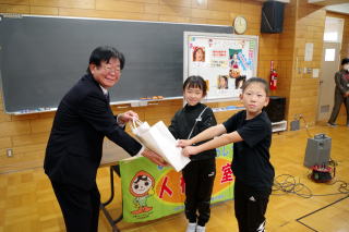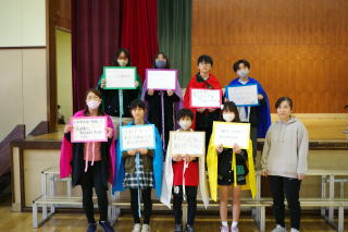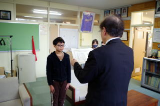 | 登別市民憲章推進協議会は啓発活動の一環として、市内全7小学校の4年生を対象に標語を募集し、コンクールを行いました。本校から金賞に1名、優秀賞に2名が入賞し、その賞状伝達が行われました。 | |||