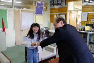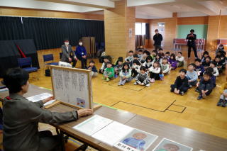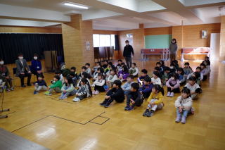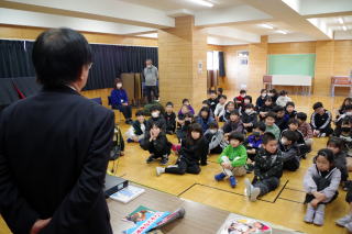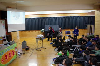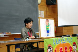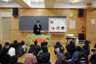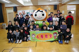 | 各地区の人権擁護委員と法務局職員が「いじめ」等の人権課題の解決を目的に行っている「人権教室」が今年も行われました。2名の室蘭登別市人権擁護委員の方と札幌法務局室蘭支局職員の方2名をお招きし、2年生を対象に行われた教室では、「いっちゃんごめんね」という紙芝居を見て、一人一人の個性の尊重や友達への言葉かけの際に気を付けることなどを学びました。4年生を対象に行われた人権教室では、DVD「ありったけの勇気」というドラマを見ました。ドッジボールの練習からクラスのリーダー的な子が一人の子をグループでいじめ、それを助けた子が今度はいじめられます。しかし、一人一人がいじめを許さないという勇気を持つことが大切で、見ていた子どもたちもその勇気の大切さを感じていたようでした。記念撮影ではキャラクターの「じんけんまもる」くんが登場し、子どもたちも大喜びの中、記念撮影をして終わりました。 | |||
