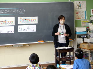 | この日から1年生の給食がスタートしました。初めての給食ということで、まずは配膳の仕方をしっかりと学習します。給食をこぼさないように、そしてスムーズに受け取って自分の席に戻ることを学びました。この日のメニューは「ワンタンスープ」「若鶏のごま照焼き」「ごはん」「牛乳」でした。苦手なメニューもあるかなと思われましたが、どの子もできるだけ食べようといっしょうけんめい残さずに食べていました。後片付けも、先生から教わった通り、しっかりとできました。 | |||