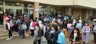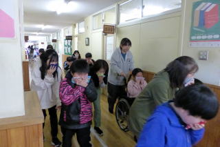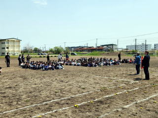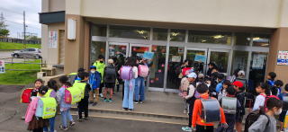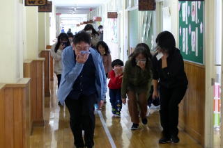 | 火災を想定した避難訓練が行われました。家庭科室から出火したという校内放送連絡を受け、どの学年もすばやく定められた避難経路を通り、校舎外に出てグラウンドに避難しました。登別消防署の方に来ていただき、避難の状況について講評をいただき、避難の際に「煙を吸い込まないようにハンカチを口に当てて避難する」など気を付けることを教えていただきました。