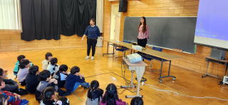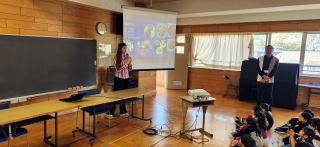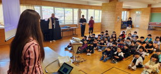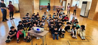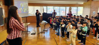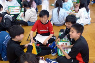 | 1年生が小学校で初めての外国語活動の学習をしました。1・2組合同で多目的ルームに集まり、はじめにALT(外国語講師)の先生の自己紹介ということでスライドを使って、出身国や家族のこと、趣味などについて教えていただきました。更に時刻によってのあいさつの仕方を教わりました。次に英語の歌遊びで、体の各部分を英語で言いながら触っていく歌を歌いました。 最後に色の英語での言い方を教わり、ALTが言った色を部屋の中から見つけタッチするゲームをしました。すでに英単語をわかっている児童も多く、楽しんで学習できました。 |