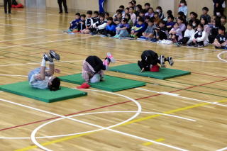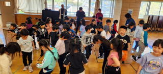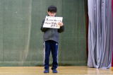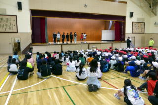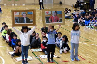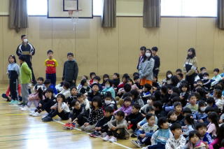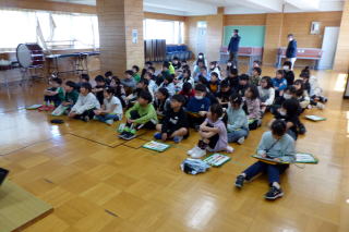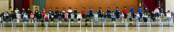 | 今年入学した1年生45人を上級生が歓迎する「1年生こんにちは」が行われました。はじめに1年生が入場しました。6年生に手を引かれ、ステージひな壇に導かれていきました。早速「1年生自己紹介」ということで、1年生全員から、呼びかけ形式で、全体に向けてのあいさつが行われました。次に各学年からの出し物でした。始めに2年生は、間もなく行われる運動会の紹介ということで、玉入れやダンスを実際に見せてくれました。3年生は学校クイズということで、校長先生の写真はどちらか、図書室は何階にあるかなどのクイズでした。4年生はいろいろな縄跳びの跳び方や長縄を飛んでいるところを見せてくれました。5年生は学習発表会について教えてくれました。リコーダー演奏や昨年の1年生が躍ったミッキーマウスのダンスを見せてくれました。6年生は体育の器械体操の様々な技や器楽演奏を見せてくれました。また発表中に作成した折り紙の作品を1年生にプレゼントしてくれました。校長先生のお話では、今回の行事のように、みんなで力を合わせて様々な行事や学習に取り組んでいきましょうと呼びかけられました。発表の随所で、大きな歓声が上がり、盛り上がった集会の中、1年生も喜んでくれたようです。
