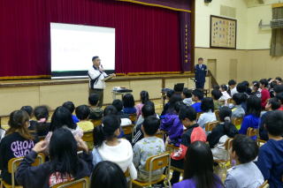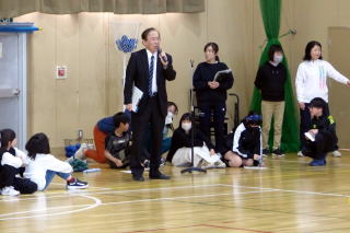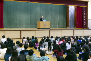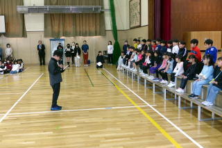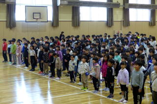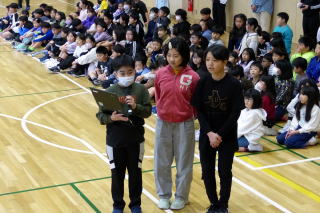 | 今年度最初の全校朝会が行われました。今回はなかよし会(児童会)の任命式が行われました。担当の先生から委員会名を呼ばれ、その委員の児童はその場に立って、全校児童に紹介されました。次に各委員会の委員長がステージ上に上がり、活動の説明と全校児童への協力のお願いが発表されました。なかよし会の中心となる6年生の面持ちには、強い責任感が感じられます。学校のリーダーとして活躍を期待します。 |