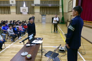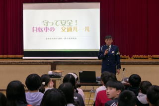 | 3・5年の交通安全教室が行われました。本来であれば、各自、自転車を持ちより、室蘭総合自動車学校にご協力をいただき、教習コースを実際に自転車に乗って、自転車乗車の際の交通安全について学ぶ予定でしたが、あいにくの悪天候で、外での学習は中止となり、体育館で室蘭警察署の交通課の方を招いての学習となりました。交差点の渡り方やヘルメットの重要性などを動画を交えながら、詳しく教えていただきました。実際に自転車に乗るときにも、学んだことを生かして気を付けるようにしていきましょう。 |
