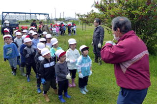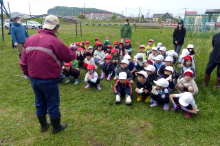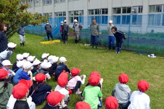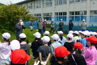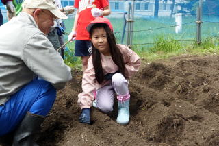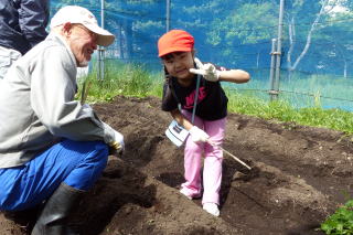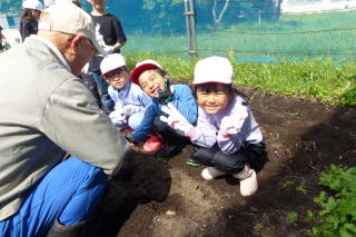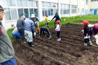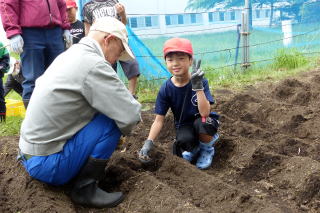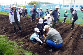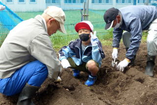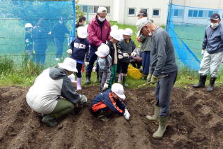 | 「ふれあい農園」ということで、地域の方々を「畑の先生」ということでお招きし、1・2年の生活科の学習でジャガイモの植え付けを行いました。9名の方々がご協力下さり、ジャガイモの植え付けを教え、手伝ってくださいました。この学習でも、久々に地域の方々と一緒に活動ができ、楽しく植え付けを行うことができました。秋の収穫が楽しみです。 |