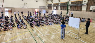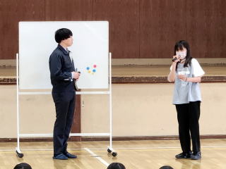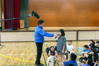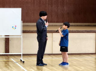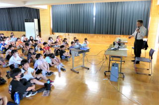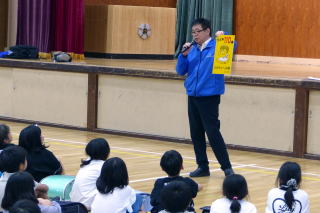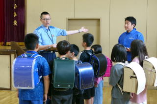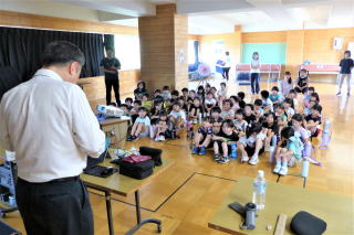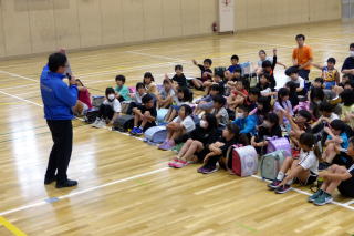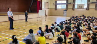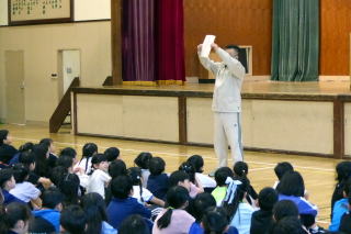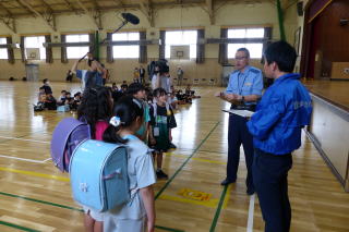 | 全校児童を対象に、室蘭警察署の方を招いて不審者対応訓練が行われました。不審電話がかかってきたときのの対応や道で不審者に声をかけられたとき、不審者から盗撮された時などの対応について、高学年から代表の児童が警察の方が扮した不審者と実際にやり取りをして、注意すべきことを教えていただきました。実際に起こりうることとして、他の児童も真剣に学んでいました。 | |||