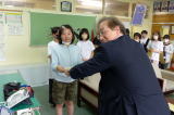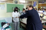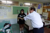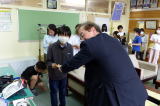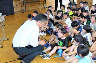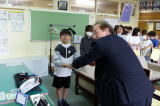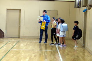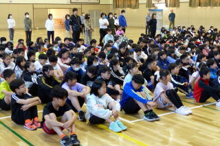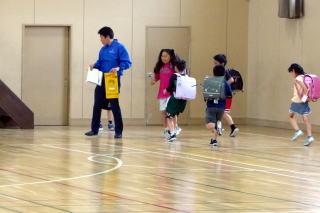| 登別市では児童が登下校中や放課後に、不審者等に遭遇した場合に、避難・保護できる場所ということで、市内各地域に「スタディちゃんの家」として一般家庭や商店などに依頼し、配置しております。今回、登別市教育委員会、室蘭警察署、校区内町内会にご協力をいただき、3年生が不審者に遭遇し、スタディちゃんの家に逃げ込む訓練を行いました。本来は実際に校区に出て、近隣のスタディちゃんの家に逃げ込む予定でしたが、あいにくの天候のため、体育館で行われました。児童代表グループが、下校中に教育委員会の方が扮した不審者に遭遇し、防犯ブザーを鳴らしたり、大声で「助けて-」と叫びながら、スタディちゃんの家に駆け込みました。そこで不審者の様子を詳しく警察の方に伝えることも行いました。もしもの時のための大事な訓練で、気を付けることをしっかり聞いていました。 | |||