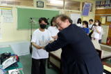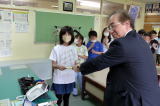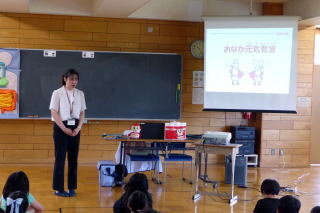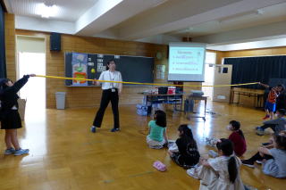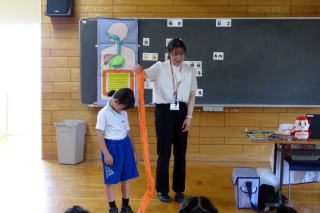 | 3年生の食育学習が行われました。今年も室蘭ヤクルト販売の方を講師に、ヒトのおなかの中の仕組みや生活リズムの大切さについて教えていただきました。小腸・大腸の長さを知る学習ではモデル教材を使ってまっすぐに伸ばしたり、自分たちの伸長と比べたりしました。また、スライドや腸内細菌の動画など貴重な映像も見せてもらいました。学習後には、ヤクルトとパンフレットなどのプレゼントもいただきました。 | |||