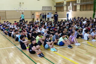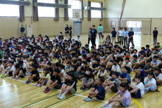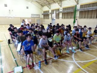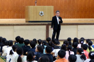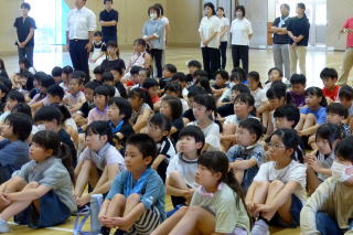 | 7月の全校朝会が行われました。校長先生の話では、運動会の頑張りについてほめていただき、1学期最後までしっかり学習や生活に取り組みましょうと呼びかけられました。その後、生徒指導担当の先生から七夕についてのお話と、教頭先生から、いじめをなくしていきましょうというお話がありました。 |