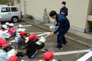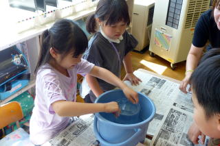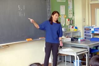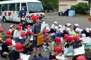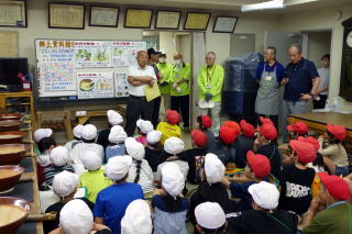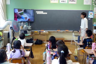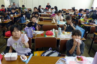 | 1年生が食育の授業で、登別市の栄養教諭を招いて「給食」について学習しました。栄養教諭の先生が給食の献立を考えていることを知り、みんな驚いたり、給食ができるまでのビデオ映像をじっくりと見ていたりと、しっかり学習していました。給食センターで使っている特大のお玉を持つ体験もさせていただきました。給食センターの方からのメッセージで「給食を残さず食べてほしい」と呼びかけられ、食物の大切さを感じていたようでした。学習の終わりには給食センターの方々にお手紙を書いて渡してもらいました。 |