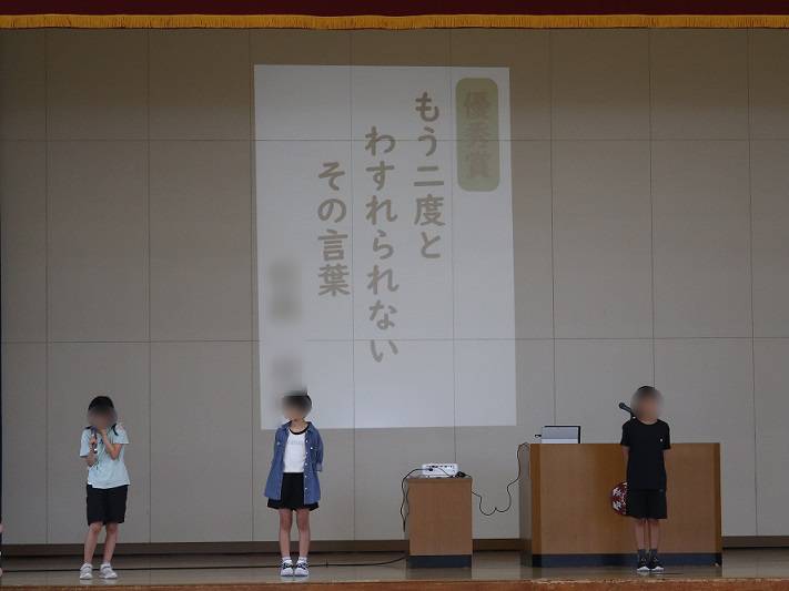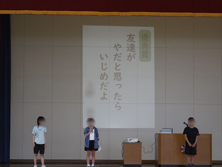 9月2日(火)に全校朝会が行われました。その中で、代表委員会の取組で3年生以上の児童がいじめ防止標語を考え、1・2年生の投票により各学年から選ばれた優秀賞の作品の発表が行われました。賞に選ばれた児童は「幌小からいじめがゼロになって、みんななかよしになって欲しいという願いを込めて標語を作りました。」と発表していました。その願いのとおり、友達同士お互いを大切にして過ごせる学校になるよう子どもたちを指導していきたいと思います。