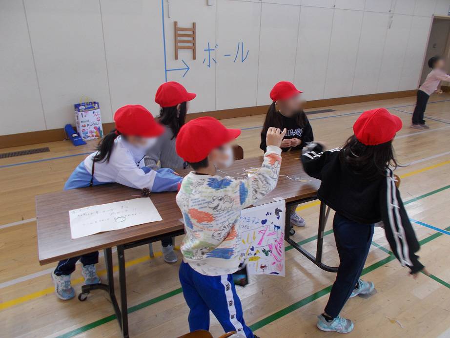 12月3日(水)に、体育館で1年生の「あきのたからものランド」と2年生の「おもちゃ大会」が行われました。1年生の「あきのたからものランド」は、本当はカトリック幼稚園と東保育所の年長さんと交流して行う予定でしたが、学級閉鎖になってしまったため今回は2年生との交流会になりました。前半は2年生の「おもちゃ大会」を行い、1年生に遊びに来てもらいました。後半は1年生の「あきのたからものランド」で2年生と一緒に作品を作ったり、プレゼントを渡したりしました。1年生も2年生もお互い喜んでもらえるようにおもちゃの製作に取り組み、どちらの活動も楽しく交流ができたようです。活動が終わった後は「たのしく作れた。」「みんなと協力できた。」などの子どもたちの楽しそうな声がたくさん聞かれた時間になりました。