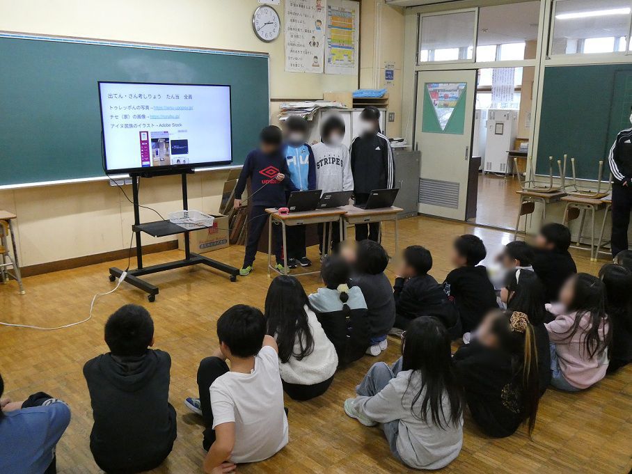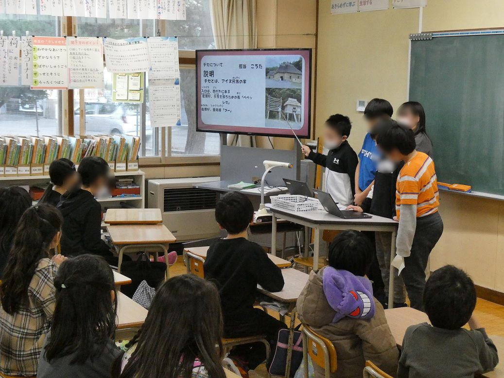 12月19日(金)に、4年生が総合的な学習の時間に今まで調べてきたアイヌ民族の文化について3年生に向けて発表を行いました。参観日に保護者の皆様に向けて同じ発表を行った4年生でしたが、今回は3年生に向けての発表です。4年生は、より分かりやすい言葉遣いや話すスピード、資料の示し方を事前に練習して発表に臨みました。3年生は次年度に学習するアイヌ民族について、それぞれのグループの発表をとても熱心に聞き入っていました。4年生は発表や進行の仕方について上級生らしいワンランク上の態度を見せることができました。