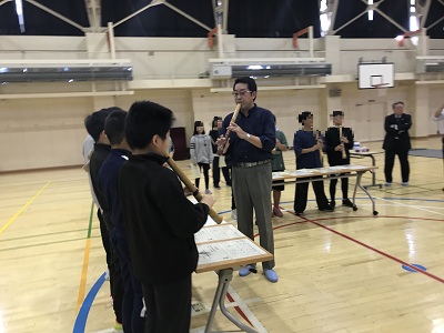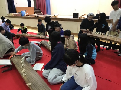 初めて尺八に挑戦した児童が上手に音を出すことができて嬉しそうでした。琴も美しい音色を奏でて