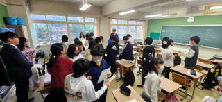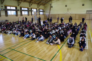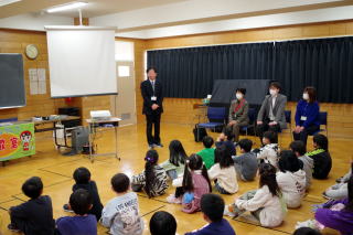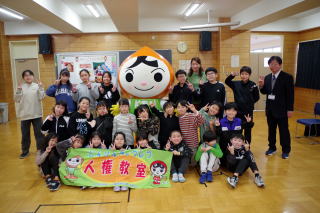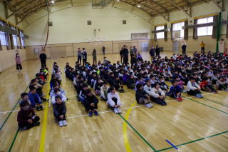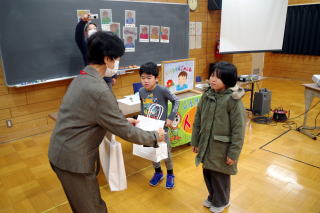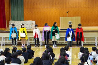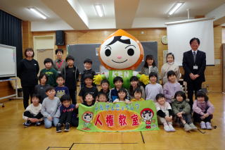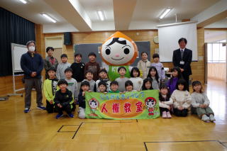 | 各地区の人権擁護委員と法務局職員が「いじめ」等の人権課題の解決を目的に行っている「人権教室」が今年も行われました。2名の室蘭登別市人権擁護委員の方と札幌法務局室蘭支局職員の方2名をお招きし、2年生を対象に行われた教室では、「いっちゃんごめんね」という紙芝居を見て、一人一人の個性の尊重や友達への言葉かけの際に気を付けることなどを学びました。4年生を対象に行われた人権教室では、DVD「ありったけの勇気」というドラマを見ました。ドッジボールの練習からクラスのリーダー的な子が一人の子をグループでいじめ、それを助けた子が今度はいじめられます。しかし、一人一人がいじめを許さないという勇気を持つことが大切で、見ていた子どもたちもその勇気の大切さを感じていたようでした。記念撮影ではキャラクターの「じんけんまもる」くんが登場し、子どもたちも大喜びの中、記念撮影をして終わりました。 | |||