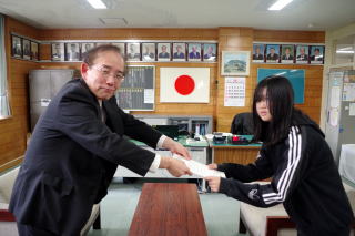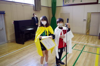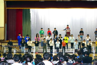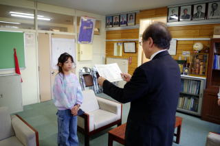 | 登別市民憲章推進協議会は啓発活動の一環として、市内全7小学校の4年生を対象に標語を募集し、コンクールを行いました。本校から金賞に1名、優秀賞に2名が入賞し、その賞状伝達が行われました。 | |||
