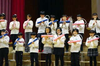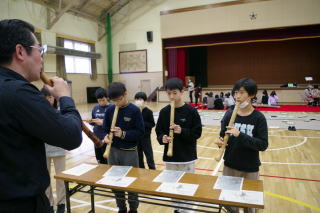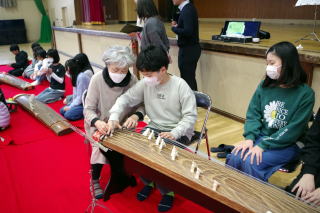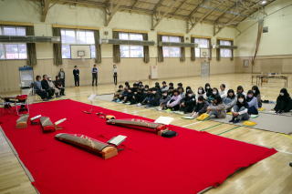 | 毎年、市内の6年生を対象に音楽の授業として行われている「邦楽鑑賞会」が実施されました。「登別三曲協会」の方々4名を招いて邦楽や和楽器について教えていただきました。はじめに「六段の調べ」の演奏を聴かせていただき、その後、和楽器について説明して頂きました。また、筝(琴)と尺八によるイントロクイズなどで楽器の音色に親しみました。続いて演奏体験では、グループごとに筝や尺八で「さくら」の曲の演奏にチャレンジしました。最後に三曲協会の方の「さくら」の演奏を聴き、児童代表がお礼を言って会を終えました。 | |||
