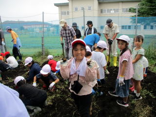 ふれあい農園ということで、地域の方々にご協力をいただきながら、1・2年生が5月末に植え付けたジャガイモの収穫が行われました。今年も大きく育ったジャガイモがたくさん獲れ、1年生たちも大喜びでした。残念ながら、1年生の後に収穫する予定だった2年生は、残念ながら雨天のため、延期となりました。ご協力いただきました地域の方々、誠にありがとうございました。 | |||