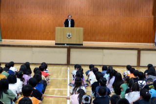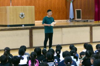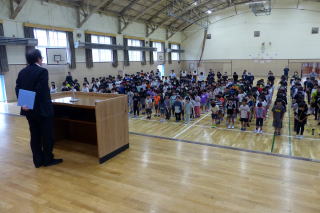 9月の全校朝会が行われました。校長先生のお話の後、生徒指導担当の先生から、9月の生活目標について「気持ちよくあいさつしよう」「安全に気をつけよう」についてお話がありました。 | |||