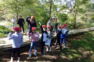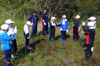 8月末の事前学習をふまえ、3年生が市内若山町の「キウシト湿原」に行き、自然探索学習を行いました。暑いくらいの天候でグループごとにウォークラリー風に湿原内を歩き、指令をこなしていきました。 湿原ということで土の中が柔らかく、長いプラスチック棒が深く刺さっていったり、植物の種を泥のボールに混ぜ込み、それを投げて植え付けたりと楽しい活動が盛りだくさんで、雨の中でも元気に学習しました。 | |||